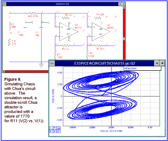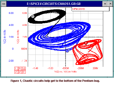 As a test we ran two simulations of Chuas circuit on a Pentium and a 486; one using the coprocessor and one using coprocessor emulation. (ISSPICE4 contains a coprocessor emulation mode.) If the results from the two 486 runs were the same, but different on the Pentium, the bug might be the cause. Unfortunately, all four answers were different. Revealing that the math libraries used to compile ISSPICE4 had just as much effect on the initial conditions as the platform.
