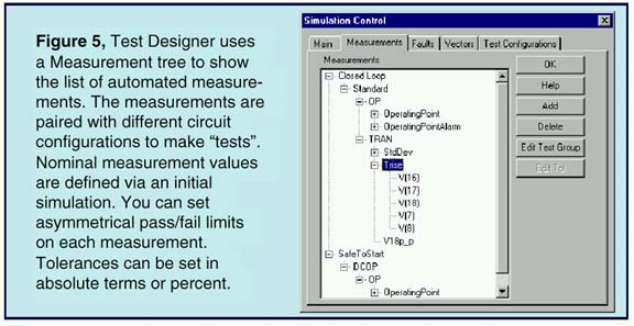The schematic entry tool integrates all of the relevant design and test information, fault analysis results, and test sequence data. You do not have to use several different programs from different EDA vendors. A single schematic database holds multiple circuit configurations, multiple test setups, the fault properties for each part (including both topological and parametric value variations), the test definitions, the measurement definitions (Figure 5), tolerances, and all results.