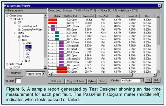 An easy-to-read histogram meter shows the state of each resultant measurement, its pass/fail status, and indicates the degree that failed measurements are out-of-tolerance. Numerical results and test limits are also shown. Each measurement can be folded out to show the results for all faults (Fig. 6).