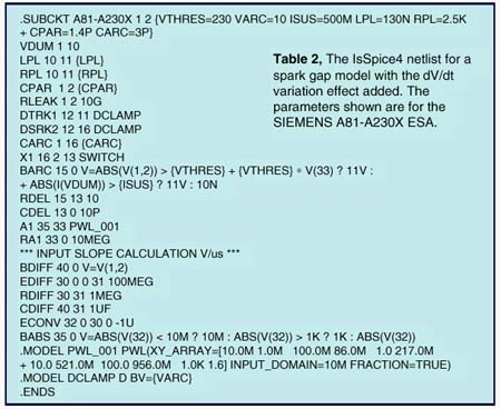 In the OFF state, the voltage-controlled switch is open and only a leakage current circulates in the ESA. The switch stays OFF until the voltage across the ESA rises up to the striking voltage. At this point, the switch is immediately driven ON and the network made of the back-to-back zener diodes and the series resistance is applied across the ESA terminals. At this point, the voltage collapses to the arc value and the current starts to rise. When the surge passes, the ESA current decays until the sustaining value is reached and the switch opens. In the first model in Table 1, the glow transition is not taken into account, and neither is the dV/dt applied to the ESA. The netlist uses standard SPICE3 elements combined with an IsSpice4 If-Then-Else behavioral element (BARC, in Table 1 below) which performs the arcing action.