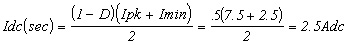 Although the primary winding peak current (see Figure 5) is 1.5 Apk, the switching regulator usually has a current limit which is 10 to 20% greater than the maximum load condition. Therefore, we choose Ipk = 1.8 Apk. Since the turns ratio is 1/5, the peak current reflected to the secondary is 9 Apk. The average (DC component of current) on the primary is: