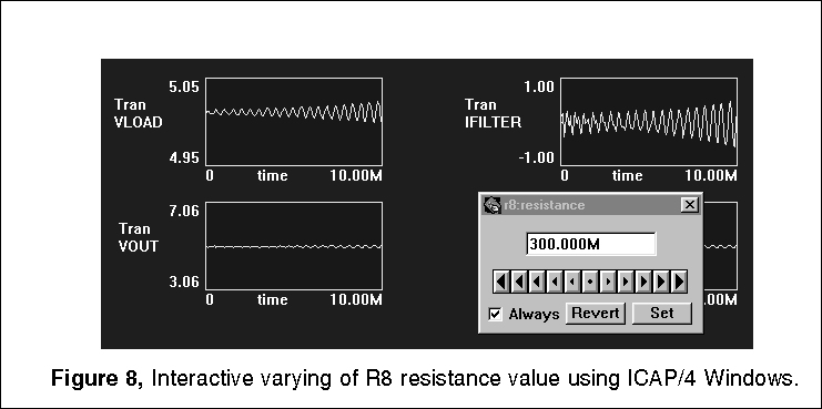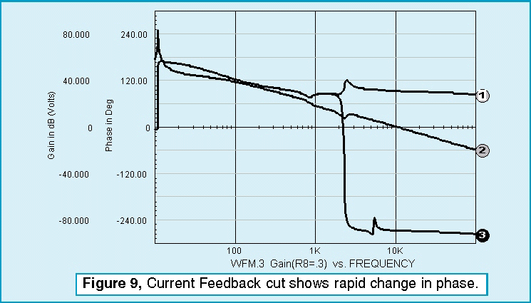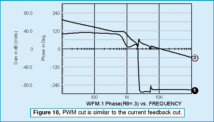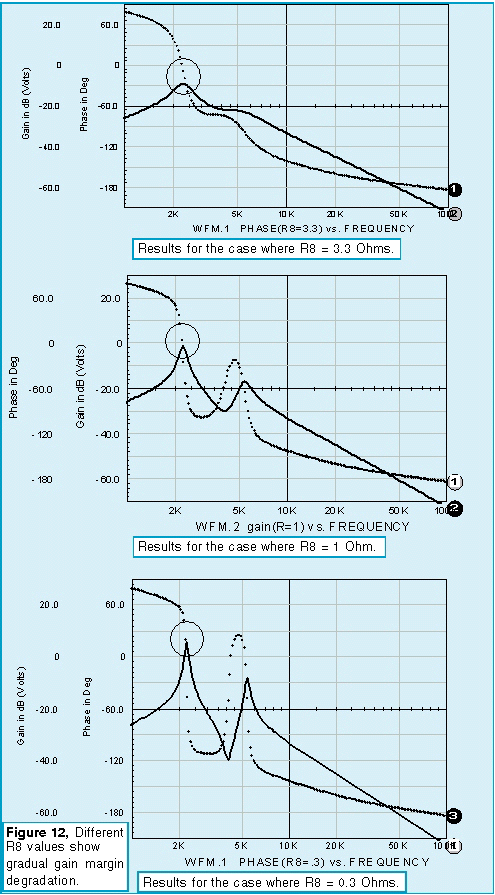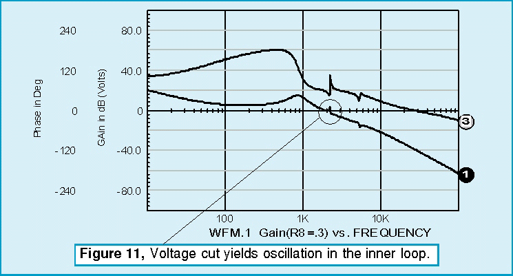 The only loop that needs additional components is the current feedback loop. Leaving the outer voltage loop inplace produces an undesirable interaction at low frequencies. To block the outer loop, a large inductor is inserted in series with the voltage feedback. All loop cuts except the one shown produce a sudden onset of instability as the zeros caused by the input filter move from the left-half of the complex plane to the right-half plane. Recall from root locus theory that the closed loop poles migrate toward the open loop zeros. Right-half plane zeros will then pull closed loop poles into the right-half plane, thus causing oscillation. From a topological view, right-half plane zeros arise in multi-loop systems because a difference in polynomial ratio transfer functions takes place. This results in negative numerator roots. This difference occurs in the pulse width modulator if you break down the small signal current and voltage transfer functions. By placing the loop cut at the input to the PWM element, the right-half plane zeros are eliminated from the open loop response, and we see a more gradual loss of stability as the gain at the cut point approaches unity (Figure 10). The voltage loop seems oblivious to the instability. Thats because oscillation is occurring in the inner loop; the poles seen by the voltage loop have already migrated to the right half plane and the bode plot isnt showing the singularity because the exact frequency wasnt selected for the analysis (Figure 11). For those who like to tweak critical components and watch the instability grow, the interactive features of IsSpice allow those endeavors. Figure 8 shows the interactive capability varying R8 and viewing the onset of oscillation in a transient simulation. Figure 12 shows the results for three different values.