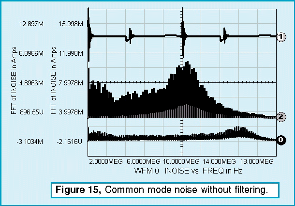 Magnetic Designer 4.1.0 was used to design a sector wound transformer with very low primary-to-secondary coupling capacitance. Most coupling comes from the power transistor to heat sink path. The heat sink could be isolated or connected directly to the chassis. Using a coupling of 5pf for an isolated heat sink .vs. 50 pf using the chassis results in the noise shown in Figure 15.