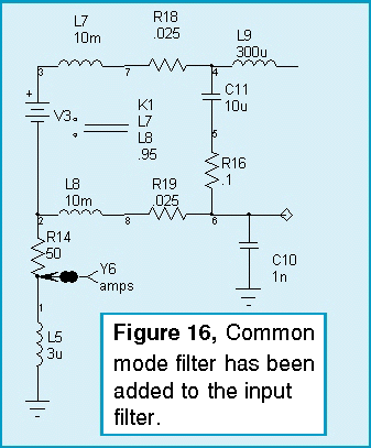 Noise is coupled into the circuit through the stray capacitance between the switching transistor and its heat sink and through the inter-winding capacitance of the forward converters transformer. In order to measure the noise, we will use a forward converter design that isbeing prepared for a future article featuring a complete power supply design using our Power Supply Designer package. The transient analysis model for the power supply is shown in Figure 14.