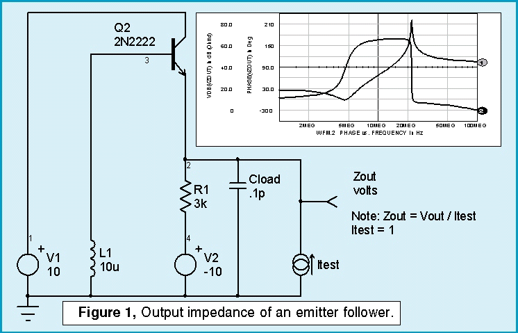 To begin with, an emitter follower becomes unstable with inductive base impedance because the transistors beta rotates the base impedance vector as beta falls off with frequency, thereby exposing a negative resistance at the emitter terminal. A capacitive load can form a resonant circuit with negative damping and therefore cause oscillations. Figure 1 illustrates the effect from an impedance point of view. In this circuit, from inspection, a capacitive termination ranging of 10 nF at 5 MegHz to 8 pF at 20 MegHz will result in exposing the negative real part of zout. This results in oscillation.