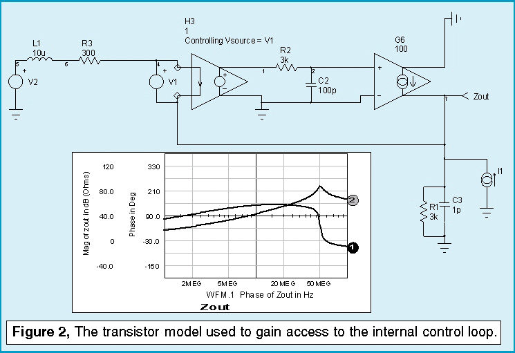 The output impedance (shown in Figure 2) using the intrinsic transistor model is similar to that which was measured in Figure 1. It would be best to use the detailed Spice model for the final result because the model automatically accounts for changing bandwidth as a function of operating point. The reason for exploring the intrinsic feedback is to find an external loop that gives decent results so that it is unnecessary to manually account for the internal transistor behavior.