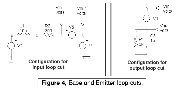 Next, the control loop is cut at the base and at the emitter, as shown in Figure 4. These configurations were easily generated using ICAP/4s configurable schematics feature. Each configuration has its private topology on a separate layer. The main portion of the drawing is on another layer. The configurable feature of the schematic allows different drawings to be made by combining different layers as needed. In this case, there were 4 drawings; zout, internal, input and output. They all share the same components, with different Spice generators and test points. The components used specifically in the internal configuration are the shaded objects which are shown in Figure 3.