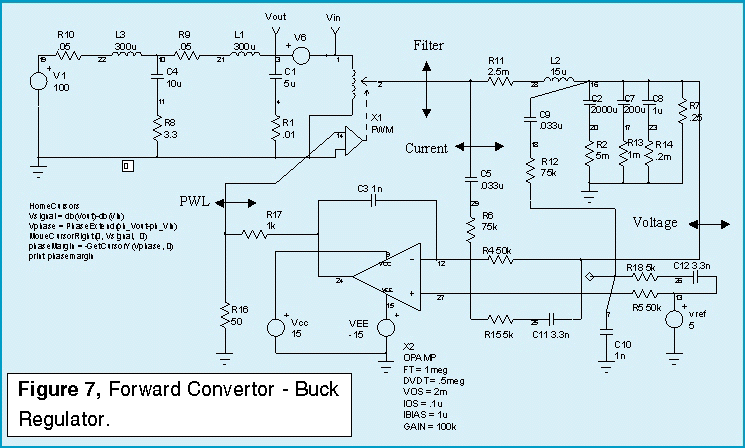 Rather than using an IC PWM, we will use this average model from the ICAP/4 Part Browser, along with a generic op-amp for stability compensation in order to draw attention to the stability issues in the control system. Figure 7 illustrates the state average model for the power supply.
