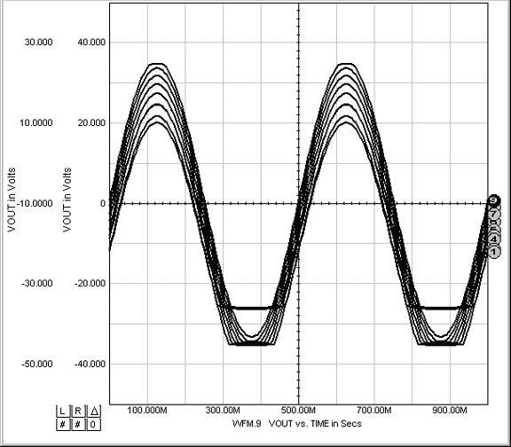 A sweep was then performed in order to study the effects due to the differences in the transistor beta values. The beta value of transistor Q3 was swept from 100 to 190 in increments of 10 (Figure 20). Notice that when its beta was 190, as represented by waveform #9, the negative half-cycle clipping distortion disappeared and maximum voltage swing was achieved.