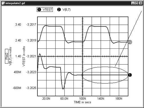 Lastly, a new automatic interpolation feature has been added so that math operations can be performed on waveforms from different simulations, even if the waveforms have different X-axis ranges and different quantities of data points. IntuScope5 automatically interpolates the data points and scales each waveform. The first displayed waveform dictates the X-axis scaling.