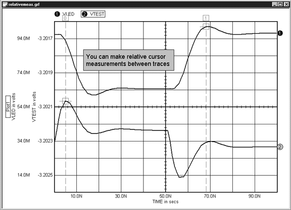 An unlimited number of cursors can be used on any plot (Figure 10), and cursors can be moved from one trace on a plot to another trace on the same plot (Figure 11). This allows the capability to make relative measurements on different traces within the same plot. In addition, if two plots have the same x-axis scaling, each trace will show dotted lines which appear on both plots as the trace is dragged, so you can now make relative measurements between different plots.