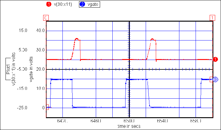 Figure 10, IsSpice time steps are focused by the pulse-forming network, producing small time increments at the gate switching edges.