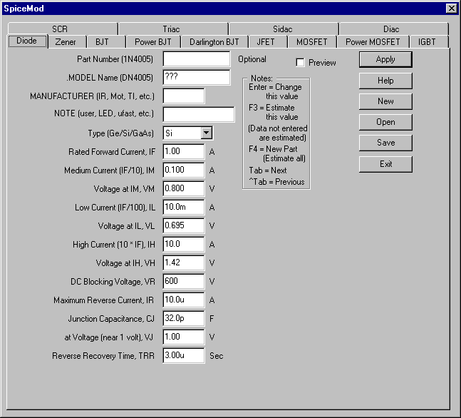 Intusoft is coming out with a new Windows-based Spicemod program. Spicemod allows you to produce accurate spice models for use with any Berkeley SPICE compatible program. The models are stored in ASCII text format ensuring easy file transfer and editing. The generated models accurately simulate DC characterization, transient switching effects, capacitive effects, temperature variations, and power dissipation. Spicemod can produce very accurate models with a minimum amount of data. As you enter data the program dynamically updates the other data sheet values to give you an even more accurate model. This feature ensures that you get a model with reasonable DC, AC, and transient behavior even if you enter the minimum values needed. Of course the more data you enter the more accurate your model becomes. SpiceMod is designed for the working engineer and allows the user to quickly and easily develop maximum, minimum, typical, and worst case models. After the user creates and saves his model he is still able to go back to the device data enter screen and see his previously entered data. This enables the user to quickly make variations of his device by just modifying the desired parameters. Spicemod5 for Windows gives you a new graphical interface (see Figure 8), new model types and more accurate models. If you have Intusofts ICAP/4Windows software you are able to instantly test out the models generated. |