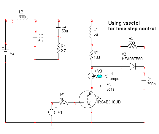 Numerical convergence in Spice simulators is closely coupled to the concept of the error in numerical integration. Reducing the time step reduces numerical integration errors. The error boundary for the numerical integration is estimated and is the basis for setting the transient step time. For many circuits, simulations contain sharp voltage steps that are not constrained by numerical integration. When this occurs, integration accuracy is unaffected so that the simulator is allowed a large time step. This results in a loss in accuracy because the excessively large time steps can jump over needed details. In the past, it was necessary to restrict this behavior by setting Tmax in the .TRAN statement. The January 2000 newsletter (http://www.intusoft.com/nl59.htm) addressed this problem using the available simulation techniques. The problems arising out of the circuit used for the January 2000 newsletter caused us, here at Intusoft, to explore IsSpice code changes that can solve the problem in a more efficient manner. It turns out there was a code fragment left over from an earlier attempt by us to solve the problem, but was not implemented because we tried to reduce the time step until a specified voltage accuracy was achieved; an impossible task for a switching waveform. Modifying the constraint, on the other hand, to test for a volt-second error produces the desired result. The latter method will always find a time step that is small enough while the earlier method will have a constant error as the time step is reduced. We introduced a new option, VSECTOL, which reduces the time step if the product of the absolute value of the error in predicted voltage (prediction solution) and the time step exceeds the VSECTOL specification. As in most IsSpice options, its default is zero, which turns the option off. In testing the new VSECTOL option, we ran some cases setting RELTO=0.5 and at the same time set VSECTOL to a reasonable value for the circuit. Figure 5 shows this new time step control option. Figures 6 and 7 show the results for a simplified power supply model versus the standard OPTIONS to control the time step. This introduces a completely new time step control for the simulation, based on node voltage accuracy. Using snubber.dwg, shown in Figure 5, as a test circuit we ran the usual analysis. All we needed to do was set VSECTOL=50n, RELTOL=.5 and BYPASS = OFF; no TMAX was needed in the .tran statement. On the other hand, many parameters were modified to get spice to run this circuit to completion, including setting TMAX to 20n. The VSECTOL controlled simulation ran faster and produced more detail in the switching transitions. The conventional simulation spent a lot of extra time when the circuit wasnt switching and took fewer points in the switching transition. The Bypass option controls whether or not the device operating point is calculated for each time step. When Bypass is ON, these load operations are skipped if errors are low enough. Since RELTOL is used in the calculations, we cant use the BYPASS logic. |