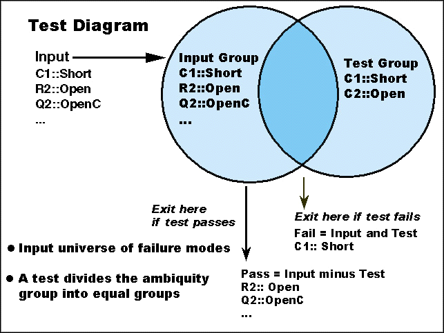 Back in 1996, Intusoft began the development of Test Designer. The final product doesnt reflect the methods that were discarded. Some of the false starts and mistakes in strategy that we discovered here at Intusoft are showing up in products being proposed even today. The fault tree approach to diagnostics and testing originated when the cost of making a single test was itself expensive. Today, many tests can be made before applying inference logic. It appears, on the surface, that the terminal leaves of a fault tree are simple intersections (see the sidebar for definitions). One could find all such intersections that reach the same conclusion and perform an Ask the Audience? type of vote. That method is actually available in Test Designer; however, after discovering the value of a guard band and proper sequencing, it has been virtually abandoned. The problem with such a voting method is that it considers each test to be equal in value. Making a fault dictionary is not exact. Lets backtrack a bit and define a Fault Dictionary. A fault dictionary contains the fault signature for each failure mode or fault. It basically gives the measured response of the unit being tested for each defined fault. The ability to accurately predict these fault signatures is no where nearly as good as our ability to characterize a good unit because the unit under test is placed in a mode that is not as well understood by the test engineer, the design engineer or the simulator. That is, its much harder to accurately predict a failed signature that it is to predict the behavior of a good device. If one were to include some uncertainty in the fault dictionary; then the intersections provided in a fault tree would probably contain multiple fault detections even though the fault tree decisions are correct. How can this be? The sequential nature of the fault tree logic prevents you from reaching spurious detections. The sequential nature of the fault tree is NECESSARY; making measurements in parallel isnt sufficient reason to do the fault logic in parallel. Here is an example showing how an unreliable test becomes more accurate if its performed later on in the fault tree logic. |