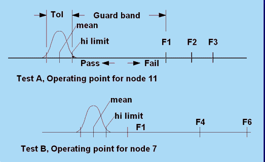 | Figure1 illustrates the importance of a proper test sequence; if test B was perfomed first, there is a high likelihood that failure F1 would be incorrectly diagnosed. When you pick measurements that give solid fault detections, you must make that decision with respect to the faults that are being input to that particular test, not with respect to all faults in the dictionary. It is for this reason that the sequential processing of test intersections using a fault tree gives better fault diagnostics than you get by selecting tests without regard to the guard band or distance between the good signature and the nearest fault signature. |