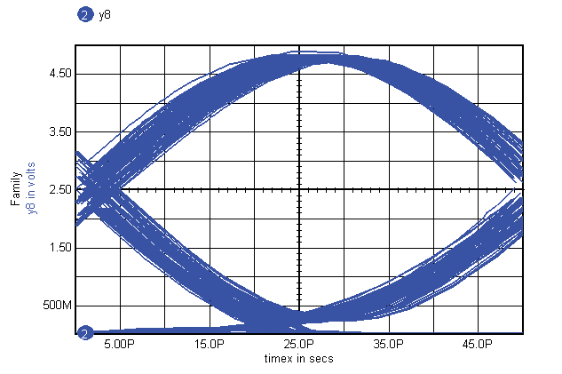 script collects all data into a single vector with a sawtooth x-axis. Figure 12 shows how this works to make an "eye" diagram. This eye diagram is used to evaluate a filter used in spread spectrum communication. A pseudo random noise signal was the input. The filter is used to limit the frequency spectrum. The filter dispersion causes the temporal spreading of the "eye." Dispersion is due to the phase delay. d(phase)/d(frequency) is not constant. You can inscribe a rectangle inside the eye to define acceptable logical thresholds along with setup and hold times. Another kind of sweep occurs when a large number of transient data runs are plotted using the Alter dialog or the plot-all button in Scope5’s Sweep dialog. For these cases, viewing an overall envelope is more desirable than plotting each waveform separately. To do this, we made an ICL script called superfamily that collects everything in a plot into a single vector with a sawtooth x-axis.