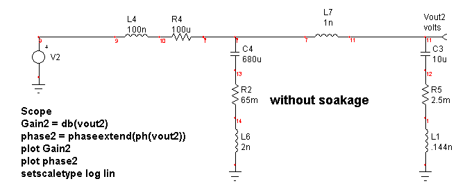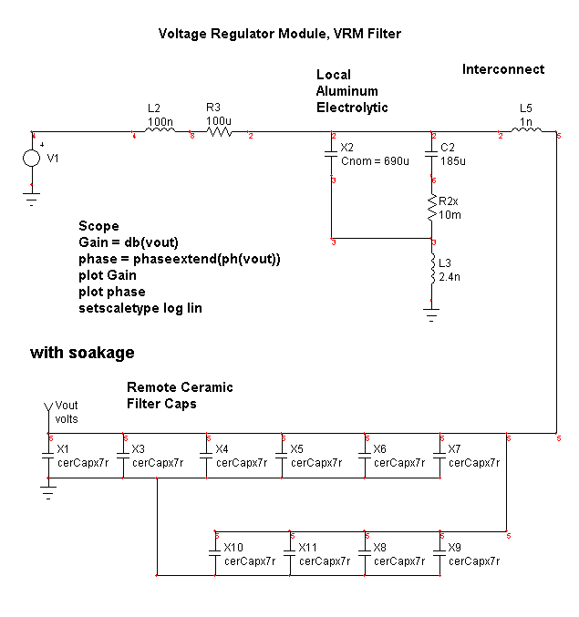 Figure 9. High DF capacitors change notch characteristics. Finally we looked at the unloaded filter section of a Voltage Regulator Module (VRM). This is typical of a circuit used to supply power to a microprocessor. The parallel ceramic capacitors are located very close to the microprocessor, with some on the chip itself. The reason for this is the ability of the chip to change its load in just a few nanoseconds from low to high power. With a 1nH interconnect, this requires 100 volts to control 100 amps in 1 nanosecond. This is beyond the capability of power supply technology so that it’s necessary to absorb these changes in load using capacitors mounted close to the chip. Figure 10 compares models with and without soakage. The switching frequency would typically be in the low mHz region.