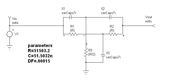 7. The output moves higher toward the previous sample. The notch filter shown in Figure 8 is a parallel filter that produces zeros of transmission when the signal taking the two circuit paths are equal and 180 degrees out of phase. If ideal components are used, the resistor and capacitor ratios shown will produce infinite attenuation. To analyze this circuit using pencil and paper, calculate the y21 and y22 for each section and add them together to calculate the overall transfer function -- vout/vin = -y21/y22 See http://www.intusoft.com/nl62.htm#2portcharacter to use simulation to do the same thing. Variations of this circuit are commonly used to eliminate the 60Hz hum in audio equipment.