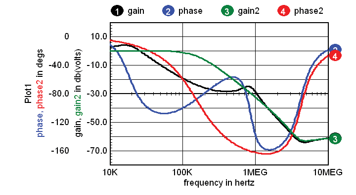 Figure 11. Comparison of conventional model (gain2, phase2) and Soakage model (gain, phase).