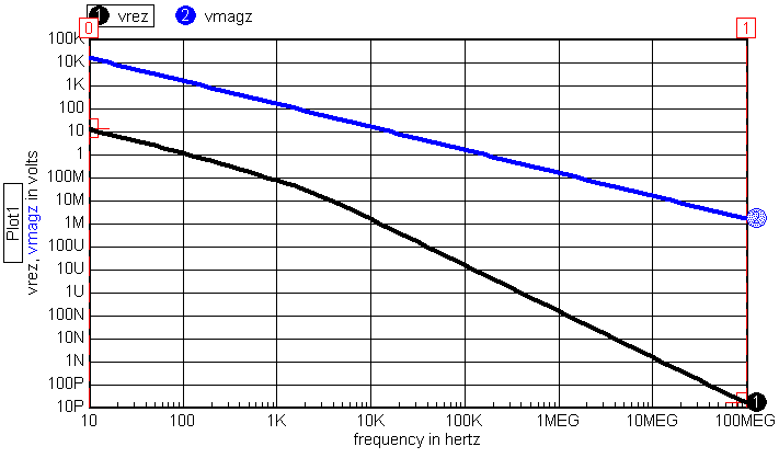 Figure 4. Plot of Magnitude (magz) and Real(rez) versus Frequency. Now, with our new model, let’s explore some common circuits to see the impact of a more accurate model. The circuits we’ll try are: