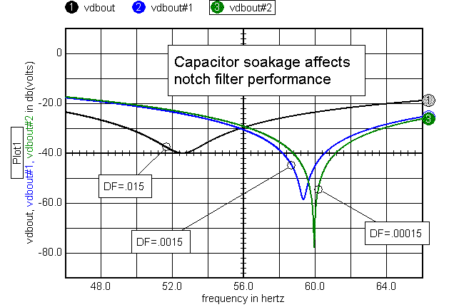 Ceramic capacitors are relatively inexpensive and small so that they become a first choice based on size and economy. Figure 9 shows how the notch frequency and attenuation vary with DF. At the very least, you will have to account for DF in selecting component values if you choose to use ceramic capacitors.