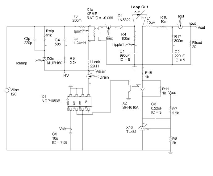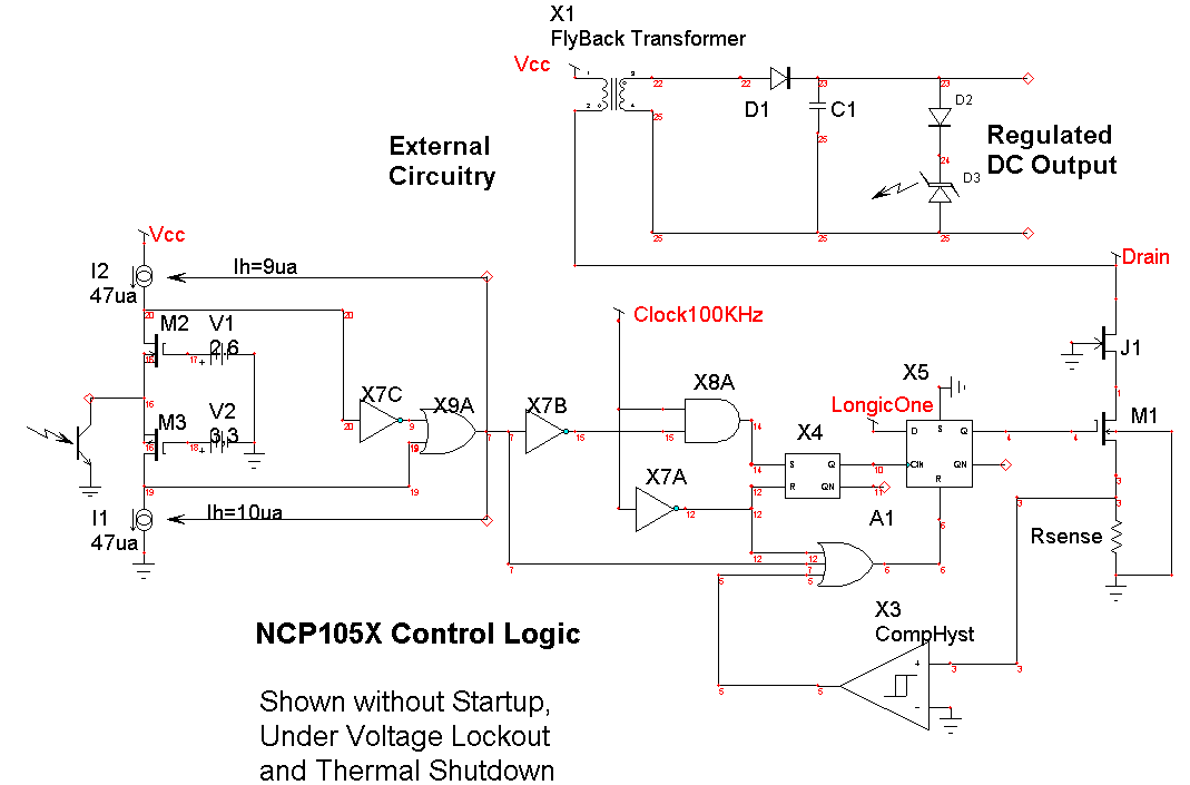Average models are used to construct a continuous time model for switched mode power supplies, SMPS. They offer the advantage of very fast simulation times and provide a linear circuit representation for doing an AC analysis. The AC analysis allows a designer to observe the loop gain and adjust compensation components to get acceptable gain and phase margins. The hysteretic power supply using an NCP1050 series IC has essentially 2 control loops. The inner loop causes the Flyback charging current to be limited using current feedback. The block diagram shown in Figure 1 shows the control loop logic. |
