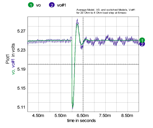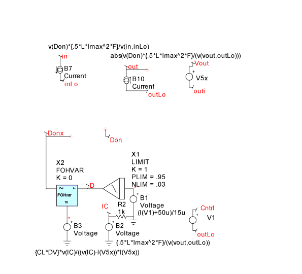 A new Spice element was needed to account for the variation in switching frequency with load. To accomplish this, a code model was made with a variable delay time connected to an input port. In the time domain, it’s just a delay, outputting the historical data according to the requested delay. In the frequency domain, it’s an e^-sT function (Z^-1). It’s combined with a continuous Laplace integrator using a subcircuit model to make a fraction order hold, FOH [1], that works in both the frequency domain and the time domain. The FOH is a generalized model that can be used to simulate a Zero order hold (k=0) on up through a first order hold (k=1) and anything in between. We used k=0 for this model. By properly accounting for large signal dependencies in the difference equations, this “average” model is also a large signal model capable of studying turn-on, line and load steps and other large signal behavior. The improved simulation speed enables us to use the ICAP/4 optimizer to center the design, getting the best performance by selecting just the right component values. With the following definitions, we can develop equations that describe the average model: