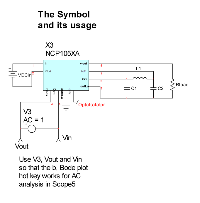 Discussion of Use and Limitations The actual circuit cannot have an exactly correct duty ratio for each cycle because of the 100kHz clock synchronizing. The duty ratio wanders around the correct result, producing subharmonic content and a more accurate average value over longer time intervals. This behavior is not expected to produce serious errors, especially in determining stability margins with respect to filter and load characteristics. The discontinuous conduction assumption is violated during start-up, so that it is necessary to add mode-switching logic. We’ll do that in a later 8.x.11 software release along with time domain validation of the “average” model using new GFT software techniques. See the article “2003 Brings New Software Updates, Server License and Macintosh Product” on pg. 13 of this newsletter. Or watch our product preview at the Applied Power Electronics Conference, February 9-13, 2003 in Miami. The NCP105XA model delivered with the ICAP/4 software is shown in Figure 4 and its use is illustrated in Figure 5. In its initial release the under voltage lockout and short circuit protection is not included. The new FOHvar model needs the updated cml.lib, power.dll and updated symbol libraries. All are available to registered users with current maintenance from Intusoft at http://www.intusoft.com/support.htm To use the average model, you need to place power.dll into <IcapsDir>\is\power.dll. Library onicavg.lib contains a model for the NCP105X power converter called NCP105XA and its symbol is in ONICAVG.sym. Models vardelay and FOLvar are in cml.lib use power.dll to account for the changing frequency with operating point. |