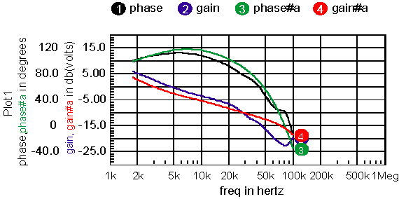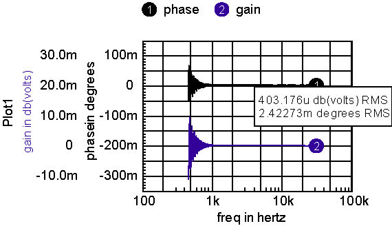 Figure 3: Filter is effective for Tstart > 1.54/Tau Figure 4 shows the result when applying the above equations for a gain of 1 with Fs=500, Fend=25k, Tsweep=100m. Figure 4: The ideal gain and phase should be zero, the gain error in gain is under .05%. Next, the input signal’s DC component needs to be removed because it results in an interfering signal at the injection frequency. This is accomplished by using a sample and hold at the output of a first-order lowpass filter. This DC value is sampled at time Tdelay for both the in and out signals. It is then subtracted from the in and out signals. The sweep rate moves a tracking filter across the 500-to-25kHz frequency range. For narrow band resonance, an error will appear if the sweep time is too fast. Figure 5 shows a typical resonant circuit with Figure 6 showing the results for Tsweep=50ms. Both phase and gain show reduced accuracy because of the relatively fast sweep. Increasing sweep time to 100ms makes the error negligible for this case. Figure 5: An RLC test circuit Figure 6: Transient simulation results compared with the AC analysis for Tsweep=50m; results almost identical for Tsweep=100ms Now, the TFA can be put together into a model. Using the approach taken previously for the GFT models, the user will be required to name the TFA subcircuit XTFA. That allows the measurements scripts to reach into the subcircuit. For example, freq:XTFA is the frequency node. That simplifies the symbol as shown in figure 7. Figure 7: Only pins that are need for interconnection are brought out The model separates the signal, pins Hi and Lo, from the measurement pins, in and out. The separation allows the model to be used either as a single injection GFT type to measure “loop gain,” or to measure voltage transfer functions elsewhere in the control loop. Figure 8 shows how it works with the forward switching regulator used in the Intusoft Power Templates. Figure 8: Comparison of results from TFA simulation; The accuracy of the TFA measured data is dependant on signal strength. It may take some adjustment to get the “right” answer. Internally, the sweep signal is connected from cos:XTFA to cosx:XTFA, using a 1k resistor. It is then multiplied by a ramp function and the Vsigpk parameter. You can modulate its value externally by connecting a PWL function between cos:XTFA and cosx:XTFA. Generally, you can increase signal strength at higher frequencies when the loop gain is small. Clearly you don’t want to use the time domain TFA if an average model is available. But if an average model doesn’t exist for your specific application, it may take several days to make a new model. An extra hour or so of simulation time is a good trade-off. And, there are topologies such as some resonant converters, that have no suitable theory for making an average model. But be aware, the long simulations will push your memory limits, so consider upgrading to 1 or 2Gbytes of RAM and even getting a faster machine! |