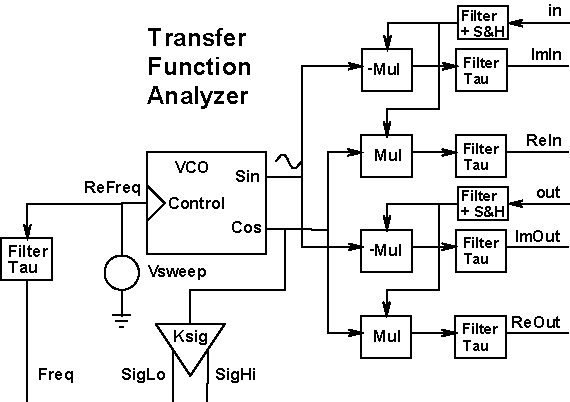 where db, phaseextend, and phase are ICL functions: The complete TFA block diagram is shown in Figure 1. Figure 1: A SPICE model for a Transfer Function Analyzer with Freq delayed to match the output delays. The approach taken here is to sweep the signal frequency rather than stepping it through a set of discrete frequencies. The frequency will be swept using an exponential function of time: