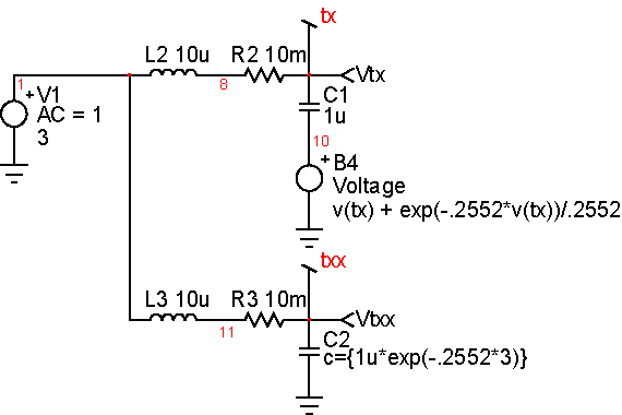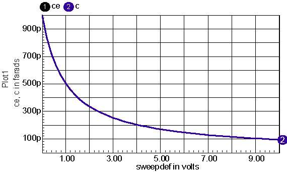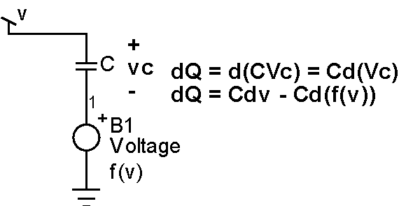 | Nonlinear capacitor models are required for any capacitor whose capacitance, C(V), is a function of the voltage applied to it. Using basic analog behavioral modeling tools in IsSpice4, such a non-linear capacitor model can be developed. Consider the model shown in Figure 13 below. Figure 13: Nonlinear Capacitor Model The model is made up of an ideal capacitor C and an arbitrary voltage source. The main task is to find an expression for B1 that will make this combination work as a nonlinear voltage-dependent capacitor model. Note, as indicated in Figure 13, the voltage for the new model is the sum of the voltage across the ideal capacitor and the voltage expression f(v) describing the B1 source. As an example, let’s define an effective capacitance as follows: Then, integrating with respect to v, and using basic circuit theory for the ideal capacitor (Q = C(v)*V), the following expression is obtained for the new model: Now we can solve for f(v), which is the expression needed to complete the model. The schematic (varicap.dwg) complies with this equation. It’s in close agreement when using a constant capacitor of value