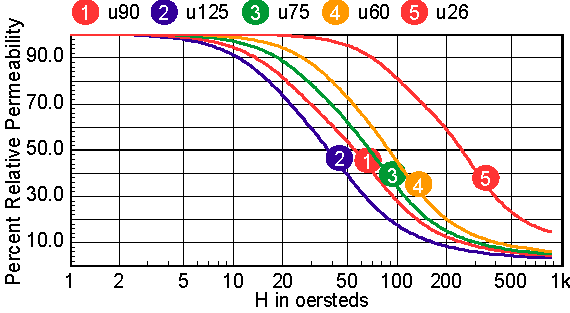 Powdered cores exhibit a larger swing in H for the same percentage change in permeability. The reason for this is because the powdered particles will saturate first where they are almost touching each other, slowly increasing the air gap as the magnetic material saturates. Solid cores with a single gap tend to saturate uniformly so that the permeability drops more rapidly. The packing arrangements and shape of the powdered particles vary, based on the manufacturing process. The solution of Maxwell’s equations in a closed form function is unknown, even for simple packing geometry. We will get around this problem by examining several reluctance models based on four generic solutions. Continuous functions for permeability are useful for defining the