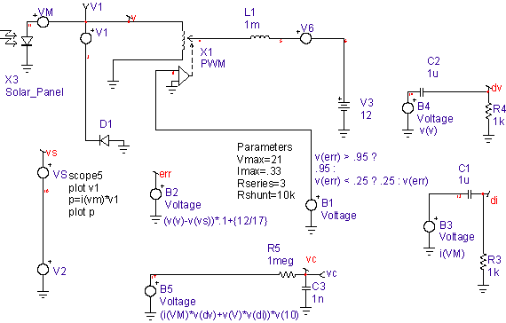 The only substantial benefit for MPPT tracking is to increase the SOC from 54% to 60% in the winter. That would not seem to justify the increased complexity in this application. So, when would you use peak power point tracking? Evidently the overhead in terms of power and circuit complexity must justify the inclusion of MPPT. For battery chargers, once you get to a 100% state of charge, then nothing you do will improve the situation. That means MPPT is only useful when the solar radiation is low, or varies a lot in cloudy climate. Even then, it’s only a 10% or so improvement, which is easily gained be increasing the size of the solar panel. On the other hand, if the battery is oversized, it will never fully charge and the maximum energy can be recovered. That’s equivalent to returning energy back to the power grid. Moreover, when energy is returned to the power grid, there must be a switching power supply so that its inefficiency doesn’t penalize the MPPT. These larger systems won’t notice the housekeeping power loss. Saving 10% on a $50,000 installation is certainly worth adding MPPT, even at the cost of a microprocessor. The peak power operating point can be tracked using a controller, or by using an estimate based on array temperature. In either case, the controlled state variable must be chosen. Normally the output current would be selected. But the output current is proportional to power and there will be two possible operating points. Notice that dv and di can be considered “small” signal parameters. So, if a relatively low frequency AC signal is introduced into the system, then di and dv can be extracted using a band-pass filter. Then the value at the dither frequency can be evaluated by demodulating the result. Now, here’s where simulation can be used to design the control system. Rather than writing the equations, the simulator can be used to evaluate the control law and set scale factors. Figure 14 shows how that’s done for the default array. First, the previously discussed solar panel model is used in X3, then X1 models a buck regulator operating in continuous conduction mode. Nodes dv and di are the dither signals extracted as though they are the only AC signals present. Later-on the PWM switching signal must be filtered. B2 is the control law for making the array voltage equal to the control signal. Finally, Vc is metered to see how it varies as the array voltage is swept using the control signal, Vs. Vs includes the dither signal from V2. Figure 15 shows the transient simulation results. Next, the signal from Vc is used for control and a step change in load is introduced to check on loop dynamics. This was accomplished by changing the B2 expression to