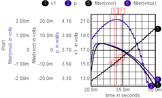 The raw products were filtered in IntuScope using 5th-order Bessel filters, Delay=3m. Therefore, you must look at the data 3ms earlier to get the correct steady state values. The cursors are set at the zero crossing and 3ms prior to the zero crossing. Both the xor and multiplier produce about the same zero crossing. The peak power point is correctly detected at the zero crossing for both cases. Power stays within 2% of the peak over a 2.5-volt range of array voltage. The array voltage should be easily estimated within that band by accounting for solar cell temperature. That suggests the simpler open-loop MPPT would be acceptable for anything but the highest cost systems. Temperature can be measured using a forward biased silicon diode attached to the array. The array voltage for MPPT is then proportional to the diode voltage. TOP To determine the “wire length” of each winding in Magnetics Designer you can do the following: Intusoft has implemented two new powerful features for IsSpice4 Transient Analysis. In the new 8.x.11 Build 2641, new convergence options have been added to improve the accuracy and speed of transient analysis.