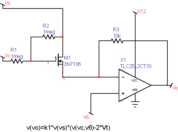 Having made an acceptable control law, the circuit implementation is needed. Three multiplications are required. That’s fairly expensive if general purpose analog multipliers are used; it’s not so bad for a microprocessor, but the sample rate needs to be high compared with the dither frequency. Continuing from an analog design perspective, the I*dv and V*di products are no more than variable gain circuits. Sometime in the 60s an unknown author described how to do this economically using a field effect transistor. Both JFETs and MOSFETs operated in the “linear” region (that’s physics talk for the engineers saturated region) follow the equation shown below for the grounded source configuration: For MOSFETS, you set, where W is the channel width, L is the length, and BETA and Kp are gain parameters. Both MOSFETS and JFETs work with slightly negative Drain-Source voltages (less than a diode drop). Now if you connect a large valued resistor between the drain and gate and an equal valued resistor to a control signal, then, Substituting back into the first equation, And the conductance is then proportional to the control voltage. Placing the FET at the input to an op-amp has the effect of making a 2-quadrant multiplier shown in Figure 17.