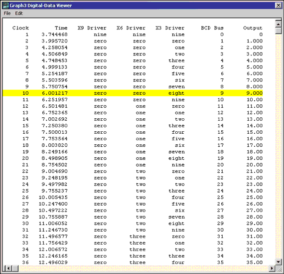 BCD Bus: The fourth bus is one that takes binary-coded decimal data from the inputs to the X2, X5 and X8 drivers, and sends it to the DAC "X10." It's entitled the "BCD Bus." In this case there are 12 bus nodes, and "BCD" is selected in the Encoding drop-down list. The appropriate Display setting is "Decimal." The Invert check box was not checked. The following node names were entered in the dialog:
