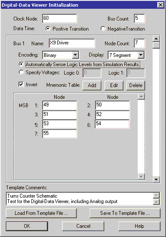 Clock: The clock node is node 60 on the drawing, so 60 is entered in the Clock Node field of the dialog. In this schematic, the time of interest is the positive edge of the clock pulse, so the Data Time: Positive Transition radio button is selected.