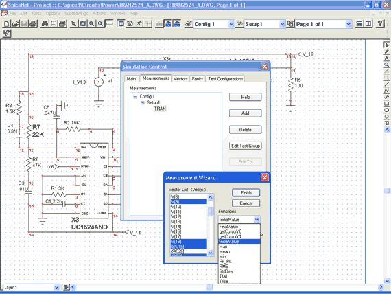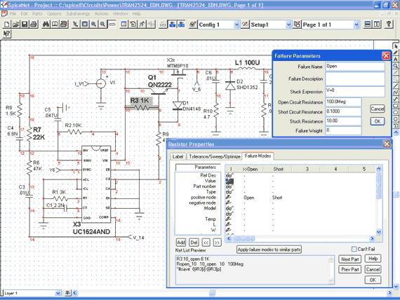 Introduction Through the decades the design automation industry has touted accurate simulation of electronic products from concept to production readiness. SPICE simulation for analog and mixed-signal circuitry has been no exception, including its unique ability to mold designs for production compliance. Analyses like Monte Carlo and worst-case simulation mimic variations in real-world component tolerances on a design, so it can be tweaked for acceptable performance. Such variation is valuable because it cannot otherwise be performed with a lab prototype board or production unit. But establishing good design margins is not the only factor that helps ensure a product's performance merit. What happens when a part goes sour in the field, such as a short, open or stuck-at value, or if a power supply faults? What effect could this have on a product's end use? The product designer should be privy to end-use risk (i.e., security monitor, backup power system, automobile ABS), but the cause and effect of failed parts is something that's best scrutinized early in the design process, not in the field. Historically, digital simulators have provided fault diagnosis to analyze the outcome of component failures, viewing the effects that faulty devices inflict on critical design signals. Today, such automated capability is also available for analog-based design (and with mixed digital) by way of Intusoft's automated fault simulation. Traditionally without this capability, a designer had to employ any number of tricks to painstakingly insert circuit faults. A super-high resistance value (i.e., 1G ohm) could be inserted as an open condition, or a wire might be inserted in place of a component to impose a short. A certain value might be temporarily assigned to a transistor's temperature coefficient to force "stuck at" condition, or an "open" from base to emitter. Manually inducing thorough fault coverage in this fashion could take days-to-weeks to setup and simulate, including the need to track an immense amount of alteration to the design database. Automated fault coverage on the other hand spares the designer from this lengthy and impractical task. In short it provides a convenient means of first assigning pass/fail limits to components' electrical properties (i.e., max power, RMS voltage, transistor collector current, rise time, propagation delay, etc.). Signal variation limits are similarly prescribed for desired lines. Then, shorts, opens and "stuck at" values are assigned to passive and active devices, as well as faulty levels for device temperature and power supply sources. After enabling any number of these conditions, fault simulation is run. Resulting electrical measurements are automatically recorded for desired components and signals lines, including readouts that chart numerical data and pass/fail results. Fault Simulation Setup and Implementation You prepare a fault simulation (in time or frequency domain) by assigning fault conditions to any device (Figure 7). A type of fault can be prescribed in a "failure mode" dialog box for a part (or optionally all "like parts"), as well as power sources and device temperature. Next, Figure 8 illustrates a one-fault setup for a UC1524 advanced regulating PWM controller circuit. Using the mouse, L1 is enabled as "shorted" amongst a vast collection of other possible faults that were assigned throughout the design. The engineer also selects which electrical properties of the design to monitor during a fault run. Several signals and devices were selected in Figure 9 for monitoring their "initial value" post a fault simulation. A variety of other selectable measurements are provided in the list. The fault run (time domain) was prescribed over a 1-millisecond period. Figure 10 illustrates the resulting measured "initial value" readings, including pass/fail. However, min/max est limits have not yet been assigned.