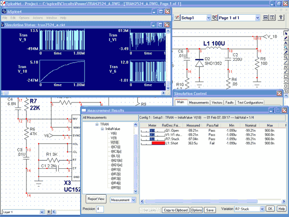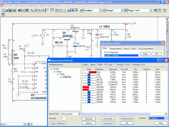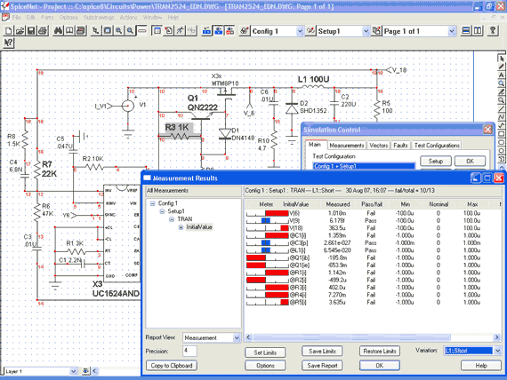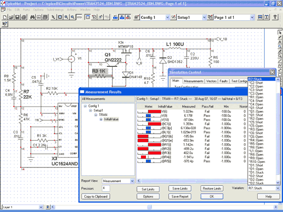 The top five fault selections in Figure 12's list are enabled (corresponding labels put in bold text on the schematic). After simulation, these faults can be randomly selected from the "Variation" menu as shown, to quickly view corresponding changes in the measured readouts on the left. Figure 13 provides a breakout of the "initial value" devices and signals on the left, showing the measured data (right) that the four enabled faults produced for the selected signal V(18). All of these features provide a fast "what-if" analysis of how faults affect critical devices and signal lines. Also shown are thumbnail simulation waveforms that display in real time during fault runs, with V(18) in the low left corner. Establishing Design Test Limits Establishing electrical test limits for devices and signal lines can be achieved in a number of ways. One method of course is to assign them per the designer's discretion. Other ways make use of acceptance criteria from product specifications and component datasheet ratings (i.e., device maximum power). For limits on signal lines, a designer can also run a Monte Carlo statistical analysis, which randomly varies component parameters through their tolerance range, then examines variation on signal lines. Once the circuitry is tweaked enough where variations are acceptable, the range can be used to establish pass/fail signal limits for fault simulation. Such limits are prescribed within the "Set Limits" dialog box for convenience. For example, the (left dialog) in Figure 14 provides a number of ways to open the min/max test limits to accept all measured readings under the present fault at hand (i.e., Q1 open). Sigma limits could have been selected if a previous Monte Carlo run was administered. The "Expand to Pass" option was chosen. Corresponding colored histograms to the right reflect the new "passed" measurements (green). This is useful for quickly studying test limit compliance with successively selected faults, that is, seeing how other faults' measured results comply with the relaxed test limits. For example, when the "R7 stuck" fault was next selected (Figure 15), some of the histograms changed color (failed) despite the new "expand to pass" test limits from Q1 open. Corresponding measured data is also shown. Conclusion Knowing how a design will operate under faulty conditions can be examined early in a product’s design-simulation phase. Historically SPICE tools have provided powerful ways of varying component tolerances and temperature to study signal variation for manufacturing compliance. This method and other means can also be used to establish pass/fail criteria for acceptable operation under fault conditions. In the end, design safeguards can be incorporated early in the design cycle to help eliminate possible damage from faults encountered in production and in the field.