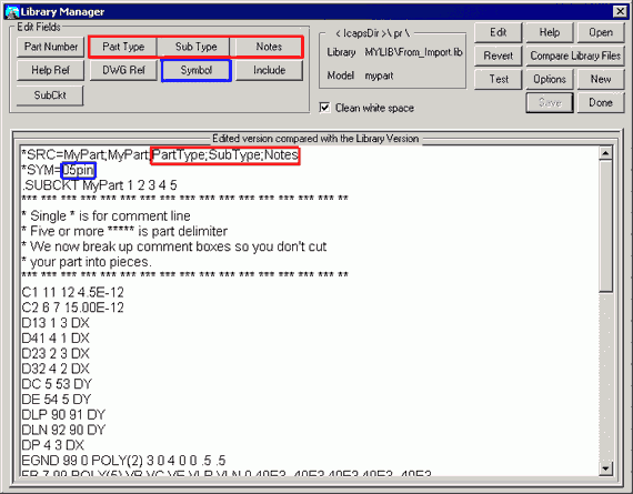If you have a SPICE part in IsSpice4 compatible format then you can easily import the part and add it to the part browser. Highlight the individual part you want to import and copy it to your clipboard. In SpiceNet's File menu select "Import Spice Model" and press the "From clipboard" button. If the model name on the .subckt line does NOT already exist in the part database, the New Model dialog will come to view. The unique model name will be shown in the bottom right field under "Enter the new model name." By default the "From_Import.lib" file will be selected, but you can specify your own library file. Note that all user added parts are placed in the <ICAPSdir>\pr\mylib folder to keep user parts separate from Intusoft parts. If the part already exists in the part database, Library Manager is immediately brought to view with a character by character diff of an existing part and imported part. If you don’t want the existing part in the part database replaced with your imported model, then exit Library Manager without saving changes, and re-import the part again with a slightly different name on the .subckt line. Every fourth asterisk in a row has been automatically replaced with a space. This prevents the problem of imported parts with comment boxes made up of asterisks from being split into pieces. If a line starts with an asterisk and has 5 asterisks in a row, we know that the beginning or end of the part has been reached. Even if you only have one part in a library, you need a top and bottom row of asterisks part delimiter.