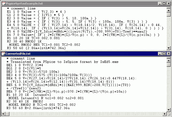 Many SPICE models are available in Pspice format. The majority of the analog syntax for both IsSpice4 and Pspice is exactly the same, but there are a few small differences that would make the Pspice model inoperable in IsSpice4 until it was translated to proper syntax. A manual conversion could be done, but this would take time and is error prone. Intusoft has created a Pspice-to-IsSpice4 Converter that instantly changes the analog Pspice netlist into a format used by IsSpice4. Simply open the Pspice netlist file in IsEd, or paste it in a blank IsEd window. From the edit menu select "Convert Pspice to IsSpice" or press the <Ctrl>+I hotkey. Another window will come to view with the netlist converted to IsSpice4 syntax. Note that the converter works on analog parts only. No Pspice digital parts will be translated.
