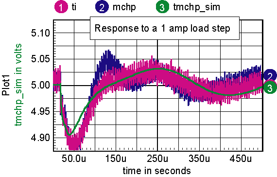 Table 1, Timing Comparison While the total in table 1 has no meaning, it's a convenient way to measure the "average" performance difference. That turns out to be about 30% in favor of Texas Instruments or about ½ the advantage one would predict based on clock speed. Figure 4 shows how the 2 loops respond to a step change. The "noise" is the switching ripple, which can be seen because the load switch is synchronized to the PWM clock. There is no noise in the simulation because average modeling techniques were used. The difference in test vs. simulation is due largely to capacitor modeling.