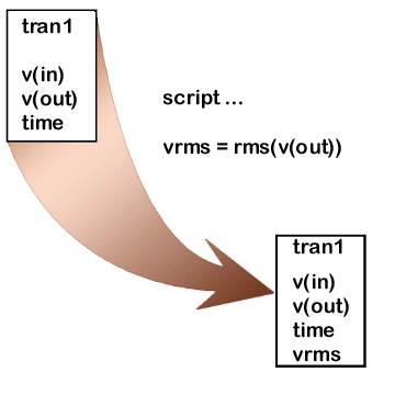 "vrms = rms(v(out))" produces a new vector called "vrms"., illustrated in the figure 1.control save v(out) save v(in) tran 1n 100n