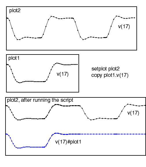 The copy command copies a vector from another plot to the current plot and re-scales all similar vectors in the current plot. The copied vector has a postfix added, "#plot", where "plot" is the source plot name. If the vector copied is the default, for example, "copy tran1.default" then no vector is copied, but a new scale is made and the vectors are interpolated to fit the new scale.