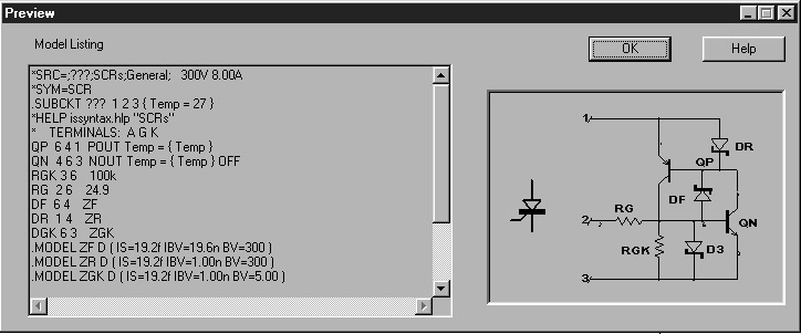 A Minimum Amount Of Learning Is Required SpiceMod contains a complete on-line help system with information on the data sheet parameter requirements and the SPICE model and subcircuit parameters produced. Critical equations detailing device operation are also given. Making And Editing Libraries Creating libraries of device models is easy since SpiceMod can search old files for models and update or add to them as desired. This will allow you to build on the SpiceMod models and add any non-standard SPICE parameters that your simulator may require. |
