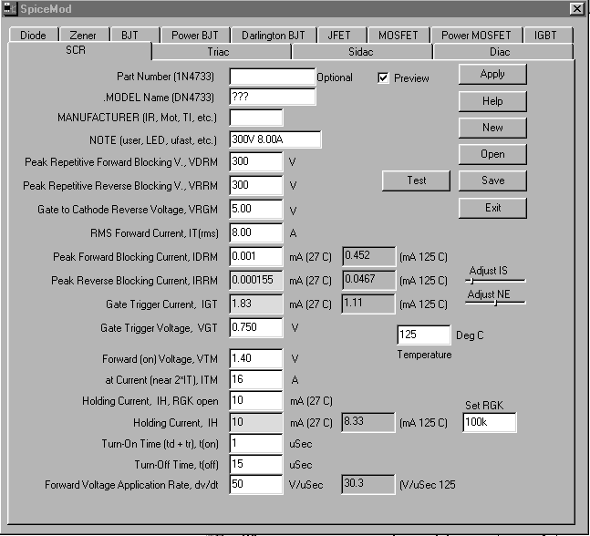 Clicking preview causes SpiceMod to display the resulting .MODEL statement. You can actually see the model parameters update as you enter data in each field.