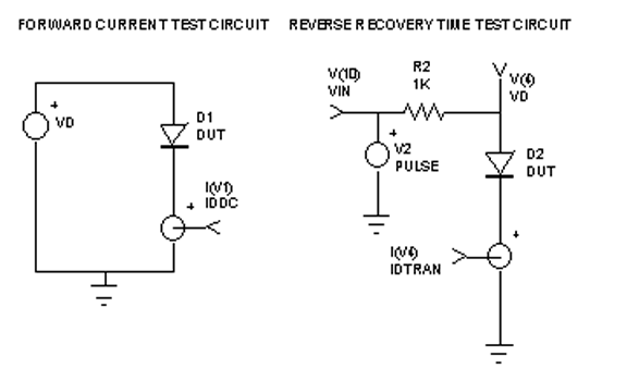 Testing The Diode Model Now that the model is complete, we can verify the performance. To test the 1N4148 diode we have just created, we will use the SPICE test circuit called DIODETST.CIR. This test circuit has two parts and performs two tests; diode forward current vs. voltage and reverse recovery time. The schematic diagrams for the test circuits are shown below. The SPICE netlists and instructions for these circuits can be found in the Testing The Models section later in the SpiceMod documentation.